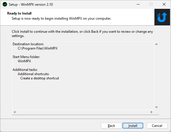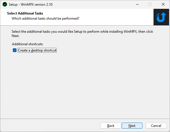- スタートメニューに作成するショートカットの設定を確認して[Next]をクリックします。