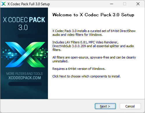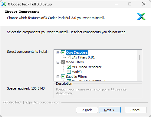 X Codec Pack には、コア機能として「LAV Filters 」、字幕の再生に必要な「DirectVobSub (VSFilter)」、ビデオの再生に必要な「MPC Video Renderer」、オーディオの再生に必要な「MPC Audio Decoder」などのコンポーネントが含まれています。