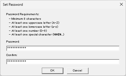 • 保存時にはパスワードの設定が必要です。パスワードにはアルファベットの大文字/小文字、数字、特殊記号を含める必要があります。